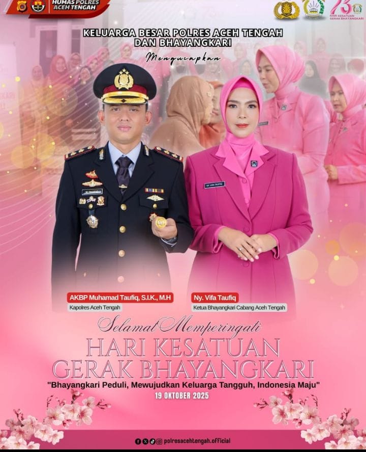 Kapolres Aceh Tengah dan Ketua Bhayangkari Ucapkan Selamat Hari Kesatuan Gerak Bhayangkari Ke-73 Tahun 2025.