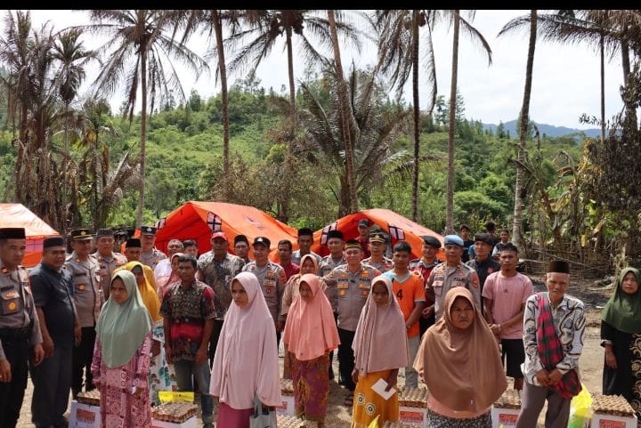 Kapolres yang hadir bersama para Pejabat Utama Polres Aceh Tengah, didampingi Kapolsek Linge serta aparatur kampung setempat, memberikan bantuan sembako dan tali asih kepada lima kepala keluarga korban terdampak langsung.