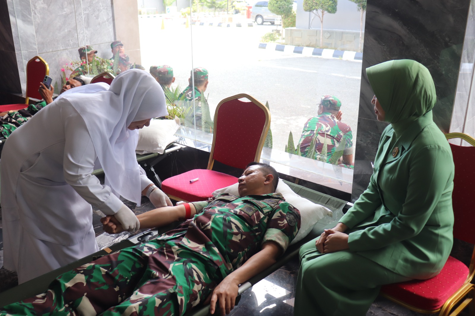 Dandim 0106/Aceh Tengah Letkol Inf. Raden Herman Sasmita, tampak hadir langsung meninjau kegiatan, sekaligus ikut mendonorkan darahnya.