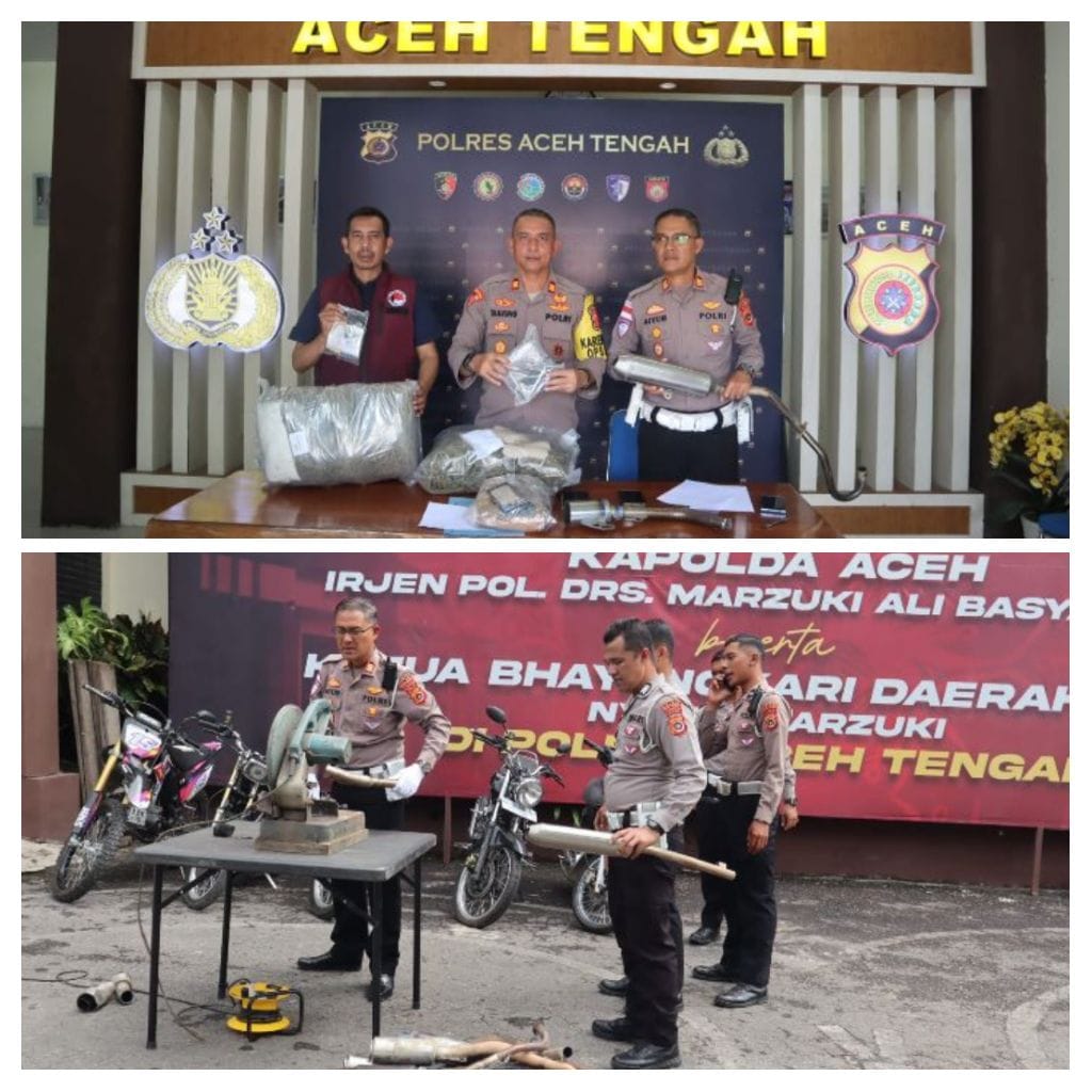 Kegiatan press release ditutup dengan pemusnahan 17 knalpot tidak sesuai spesifikasi (knalpot brong) hasil penindakan selama Operasi Keselamatan Seulawah 2026.