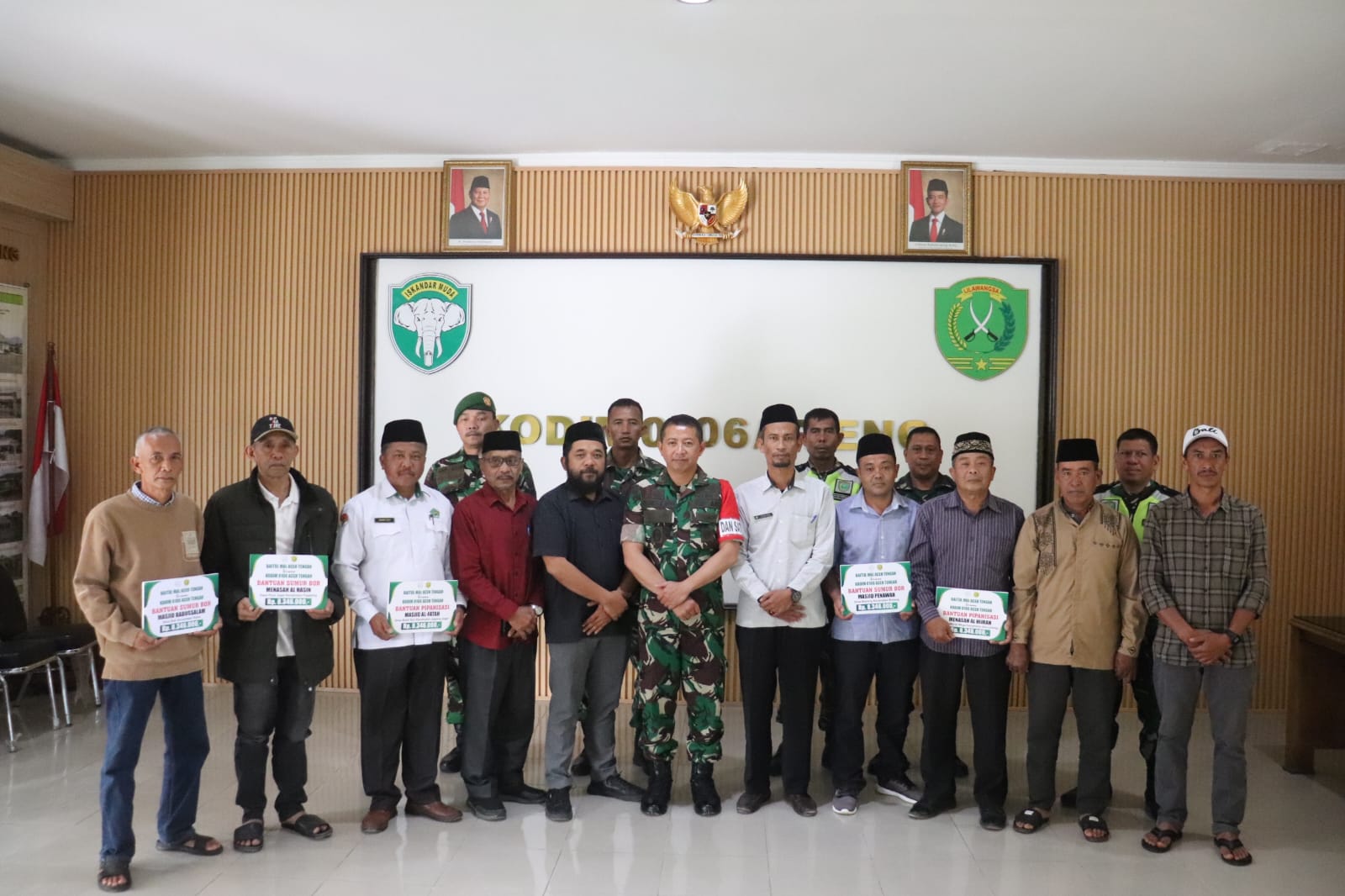 Penyerahan dana bantuan Sumur Bor dan pipanisasi bertempat di aula Makodim 0106/Aceh Tengah jalan lut tawar Kampung (Desa *Red) Bale Atu Kecamatan Lut Tawar Kabupaten Aceh Tengah.