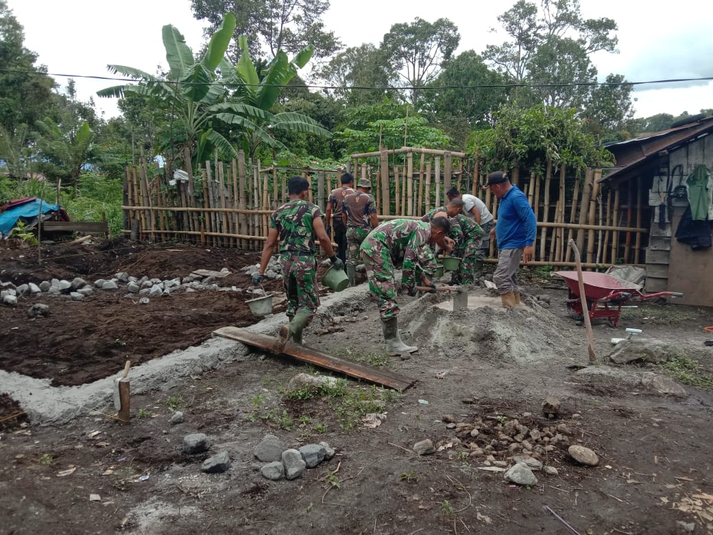 Anggota Satgas terlihat penuh semangat bersama warga membangun Rumah Layak Huni, hingga saat ini sudah memasuki mendirikan pondasi.